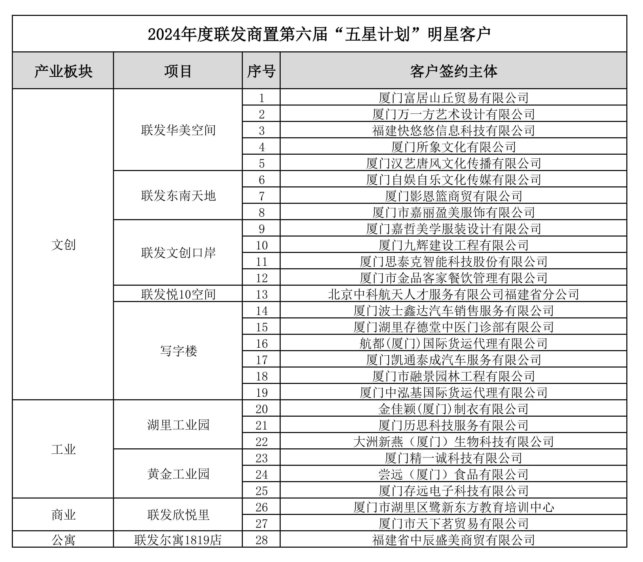 “五星計劃”是一項由廈門(mén)聯(lián)發(fā)商置有限公司發(fā)起的,聚焦公司旗下產(chǎn)業(yè)板塊項目,以服務(wù)為基礎,為合作伙伴提供更優(yōu)質(zhì)、可持續、多福利的客戶(hù)服務(wù)計劃。2024年度聯(lián)發(fā)商置第六屆“五星計劃”評選已于日前開(kāi)展,面向各產(chǎn)業(yè)板塊項目客戶(hù),經(jīng)過(guò)層層遴選,根據履約情況、合作關(guān)系、競爭優(yōu)勢、資源聯(lián)動(dòng)等作為評定標準,28家明星客戶(hù)、121家優(yōu)質(zhì)客戶(hù)摘得年度殊榮,公司將給予獲獎客戶(hù)租賃政策、公寓租賃優(yōu)惠、調整多金類(lèi)優(yōu)惠等多方面扶持。特此公示,名單如下。